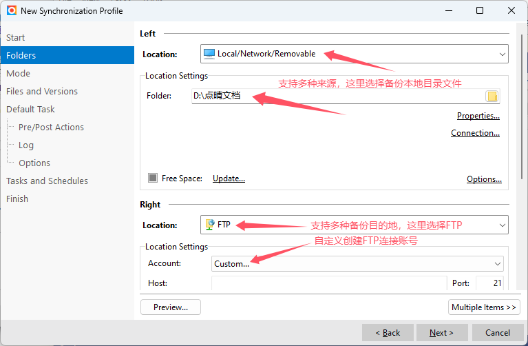 Left:備份來源,Location支持很多種,這里選擇本地目錄“Local/Network/Removable”,Folder選擇準備備份的本地目錄;
