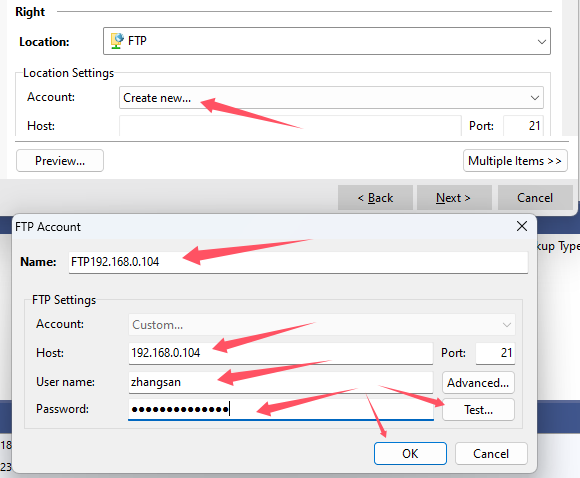 5、在上面填入FTP服務器的地址和連接賬號、密碼,確認無誤后,點擊“Test...”,測試可以正常連接后,點擊“OK