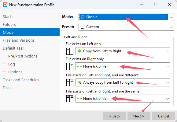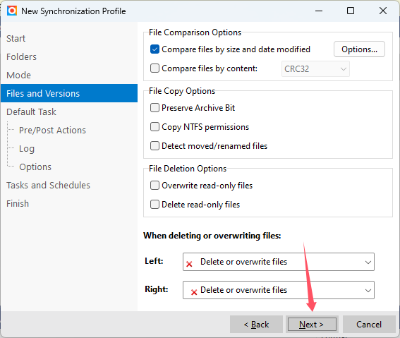 File exists on Left and Right, and are the same,選擇“None(skip file)”,意思是如果文件在兩邊都存在并且相同時,則跳過,什么也不做;