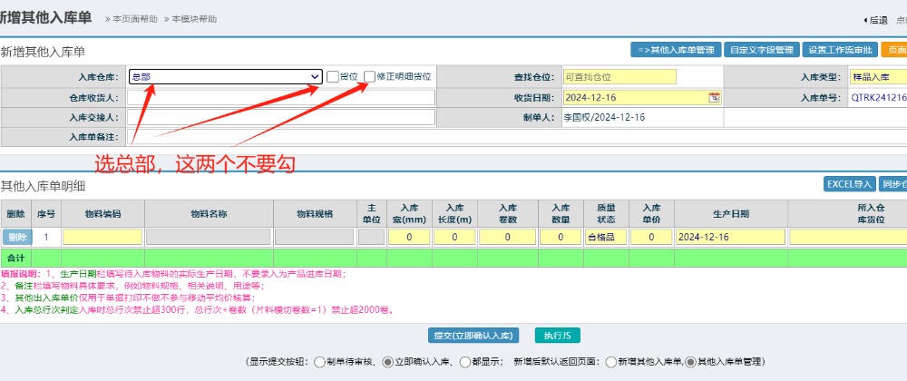 點晴模切ERP-新增其他入庫如何以基礎資料的默認倉位來入庫
