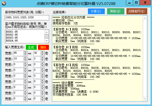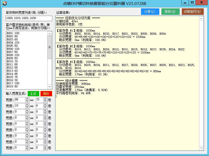 點晴ERP模切料銷售智能分切算料器,是深圳市點晴信息技術有限公司專門為模切行業(yè)推出的一款模切材料銷售分切管理智能算料的程序(從點晴模切ERP系統(tǒng)貿(mào)易版中剝離出來為一個可以獨立運行的程序),可以快速高效的給出最佳分切用料結(jié)果,實現(xiàn)最小分切卷數(shù)、最少浪費的目標。支持逾百個原始在庫物料規(guī)格設置、幾千卷不同規(guī)格的購買物料需求在...