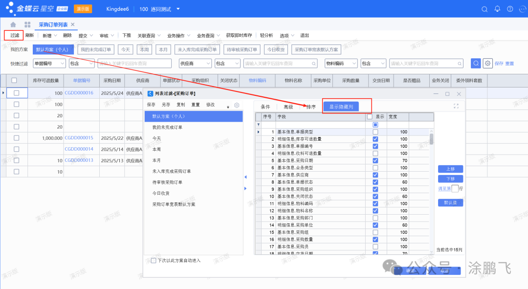 金蝶云星空運維小技巧自定義列表顯示字段這里我直接使用案例說明。以上采購訂單列表,顯示的字段不是我們理想的列表字段,有些需要,有些不需要。其實這個操作挺簡單的,我們僅僅需要進行幾步操作就可以實現(xiàn)自定義字段的顯示要求?!高^濾」??「顯示隱藏列」如下圖所示,進入列表過濾菜單。如下圖所示,勾選需要顯示的字段,不勾選不需要顯示的...