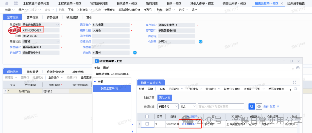 【概述】銷售退貨單的成本來源主要有以下方面:1.銷售退貨單是否由原銷售出庫單直接下推,由銷售出庫單直接下推的銷售退貨單直接取銷售出庫單的源單成本;如下圖的銷售退貨單(XSTHD000433)是由銷售出庫單(XSCKD0476)直接下推生成的,銷售退貨單的成本來源是上游單據(jù)攜帶;2.銷售退貨單如果是由銷售出庫單下推退貨通...