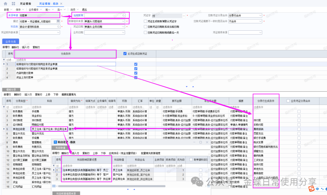 【概述】業(yè)務模塊的單據(jù),根據(jù)憑證模板生成到總賬憑證。憑證模板用于設置憑證各要素的取值規(guī)則,如憑證日期、憑證字、摘要、科目、借貸方向及金額等。根據(jù)憑證模板配置,建立業(yè)務和財務的數(shù)據(jù)關聯(lián),實現(xiàn)業(yè)務財務一體化,保證賬務處理的質(zhì)量和效率?!驹敿氄f明】憑證模板的總體編制邏輯:單據(jù)來源——適用賬簿——核算組織來源——分類條件——分...
