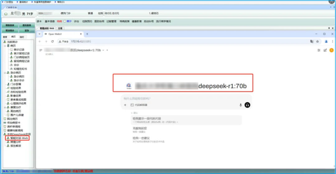 先上應用截圖:從應用截圖可以看出使用的是本地部署的deepseek-r1:70b。使用OpenWebUI實現(xiàn)了智能對話。并通過API接口實現(xiàn)了病情分析和報告解讀。報告解讀的截圖缺失,不過信息已經(jīng)夠多了。以上信息供醫(yī)療行業(yè)的同行交流學習。