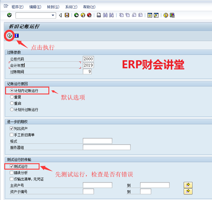 運行資產(chǎn)折舊是財務必備的月度工作,一般在月底執(zhí)行。SAP中運行資產(chǎn)折舊必須作為后臺作業(yè)執(zhí)行,并且可以將其定義為周期性作業(yè),每月最后一天定時執(zhí)行。本文介紹SAP中運行資產(chǎn)折舊的具體操作。AFAB進入資產(chǎn)折舊運行界面如下:一般測試運行無誤后再正式運行,點擊紅圈中的圖標執(zhí)行測試運行:聯(lián)機處理時系統(tǒng)默認最多處理1000條數(shù)據(jù),...