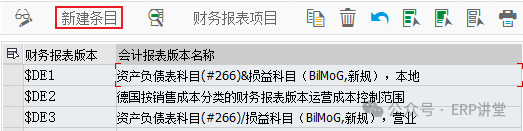 1.創(chuàng)建財務(wù)報表版本IMG-財務(wù)會計-主數(shù)據(jù)-總賬科目-財務(wù)報表結(jié)構(gòu)-定義會計報表版本1.1新建報表版本:點擊“新建條目”創(chuàng)建財務(wù)報表版本;自動項目代碼:在編輯報表版本的時候,每一行的行項目號是否可以手工輸入,如果選擇該項,則不能手工輸入;圖表/科目:每一個財務(wù)報表版本必須指定對應(yīng)的會計科目表;功能范圍程序:如果啟用功...