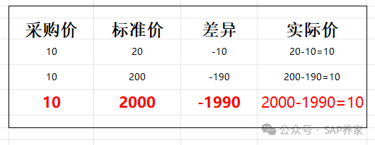 看到了沒,無論標(biāo)準(zhǔn)價格和實際價相差多大,負(fù)差異無論多大,都不會形成負(fù)單價,并且實際價都等于采購價。