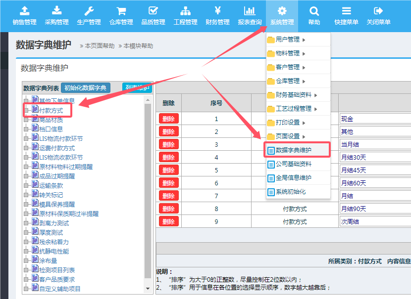 【點(diǎn)晴模切ERP】維護(hù)客戶信息時(shí)如何添加財(cái)務(wù)結(jié)款方式1、以管理員身份進(jìn)入ERP系統(tǒng)--》系統(tǒng)管理--》數(shù)據(jù)字典維護(hù),選擇“付款方式”進(jìn)行添加和維護(hù)。2、如下圖所示: