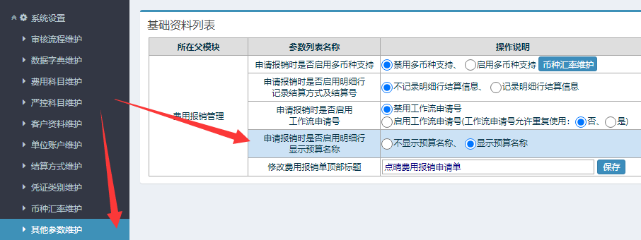 點(diǎn)晴EBR報(bào)銷申請(qǐng)單明細(xì)如何顯示預(yù)算名稱?以管理員身份進(jìn)入EBR系統(tǒng),找到系統(tǒng)設(shè)置-其他參數(shù)維護(hù)-顯示預(yù)算名稱啟用。啟用后,申請(qǐng)界面會(huì)顯示預(yù)算名稱: