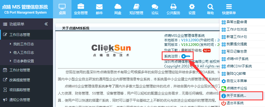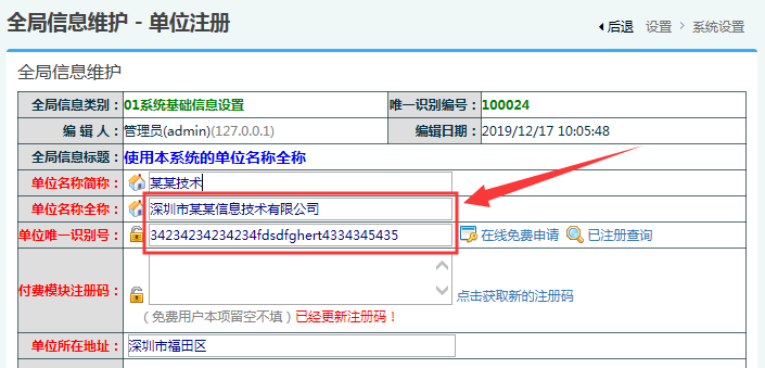 提交無誤后,就會(huì)立即看到分配到的單位唯一識(shí)別碼了,將以上紅色唯一識(shí)別碼復(fù)制下來。然后復(fù)制到點(diǎn)晴OA中以下位置(點(diǎn)晴OA-》快捷菜單-》關(guān)于本系統(tǒng)...-》系統(tǒng)注冊(cè)),提交確認(rèn)就完成了系統(tǒng)注冊(cè)。注冊(cè)后,務(wù)必退出瀏覽器,然后重新打開瀏覽器進(jìn)入,新的注冊(cè)碼才會(huì)生效。