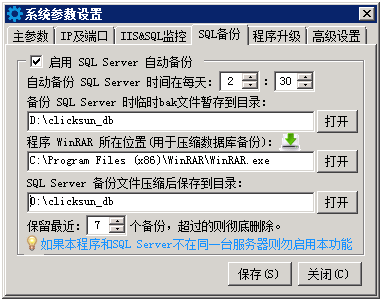 在點(diǎn)晴OA服務(wù)器上安裝點(diǎn)晴MIS信息通后臺(tái)服務(wù)程序,該程序提供了點(diǎn)晴OA數(shù)據(jù)庫自動(dòng)備份并壓縮保存的功能,并且可以設(shè)置保留最近多少天的備份,非常的方便實(shí)用。 ![]() 參考教程: