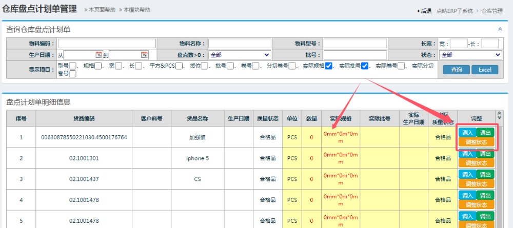 3、盤點(diǎn)結(jié)果與ERP系統(tǒng)中庫存記錄不符的,要進(jìn)行盤盈入庫或盤虧出庫調(diào)整,點(diǎn)擊上面圖五中“盤盈盤虧”調(diào)整按鈕,進(jìn)入以下界面調(diào)整即可: