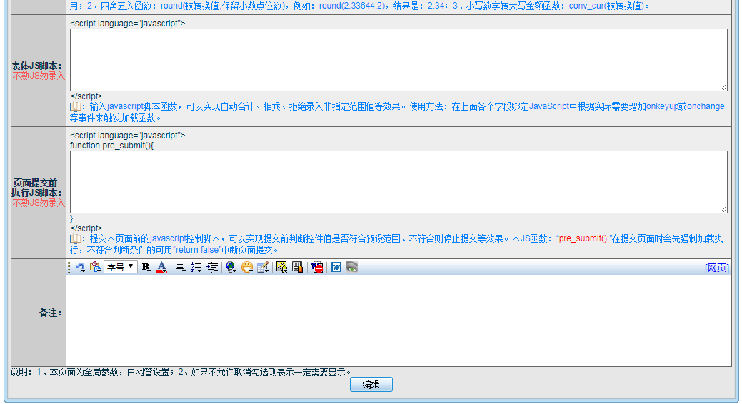 目前增加了自定義字段的有通訊錄、單位合同管理、車(chē)輛預(yù)約管理、改善提案管理、人力資源管理、低值易耗品管理、固定資產(chǎn)管理、圖書(shū)管理、項(xiàng)目追蹤管理、EBR費(fèi)用預(yù)算及報(bào)銷(xiāo)管理等模塊。 開(kāi)啟使用方法: 以管理員身份登錄點(diǎn)晴OA,進(jìn)入相應(yīng)功能模塊,在新增頁(yè)面或列表頁(yè)面上,找到“自定義字段管理”按鈕: ![]() 說(shuō)明:?jiǎn)挝煌ㄓ嶄?、個(gè)人通訊錄、外部通訊錄,均支持增加自定義字段。 ![]() 單位合同管理-》基礎(chǔ)信息設(shè)置-》自定義字段管理 在以上位置找到并點(diǎn)擊按鈕“自定義字段管理”,設(shè)置需要增加的字段: ![]() ![]() 請(qǐng)仔細(xì)觀(guān)察以上界面,可以設(shè)置增加的字段類(lèi)型、長(zhǎng)度、綁定CSS和JS、設(shè)置只讀、是否允許編輯等,并且可以在頁(yè)面上設(shè)置各種JS效果,實(shí)現(xiàn)各種需求: 1、序號(hào):就是序號(hào); 2、是否啟用:如需要使用本字段,就要勾選啟用; 3、字段類(lèi)型:系統(tǒng)內(nèi)置不可選,共20個(gè)文本型(5個(gè)250字長(zhǎng)、5個(gè)500字長(zhǎng)、4個(gè)1000字長(zhǎng)、3個(gè)2000字長(zhǎng)、3個(gè)4000字長(zhǎng))、5個(gè)數(shù)字型、5個(gè)日期型、5個(gè)富文本型(可上傳圖片和附件); 4、字段ID:系統(tǒng)內(nèi)置不可更改,文本型CS開(kāi)頭、數(shù)字型number開(kāi)頭、日期型time開(kāi)頭、富文本型ntext開(kāi)頭,后面帶流水號(hào),頁(yè)面上如果使用了JS效果,需要根據(jù)此ID獲取相應(yīng)控件; 5、自定義名稱(chēng):對(duì)外顯示的中文名稱(chēng),一般控制在4個(gè)字以?xún)?nèi)為宜,如果勾選啟用,則本字段必填; 6、默認(rèn)值:新增時(shí),本控件預(yù)置的值,一般留空即可,如果是數(shù)字型的話(huà),建議默認(rèn)值為0; 7、占用列數(shù):系統(tǒng)內(nèi)置值1/3/5/7/9,配合字段中文名稱(chēng),占用列數(shù)加1,一般數(shù)字型和時(shí)間型強(qiáng)制為占用1列,文本型可以根據(jù)實(shí)際需求增加列數(shù),例如字段為送貨地址時(shí),可以占用3列或5列; 8、列寬(px):本項(xiàng)用于列表查詢(xún)頁(yè)面,不用于新增和編輯頁(yè)面,可以控制在列表查詢(xún)頁(yè)面中需要占用的寬度,用px記錄絕對(duì)列寬; 9、允許字長(zhǎng)/最大值:本項(xiàng)用于控制不允許錄入太長(zhǎng)的內(nèi)容,用于文本型和數(shù)字型控件,后面最大值是允許使用的最大位數(shù); 10、字段綁定CSS(寬高顏色等):本項(xiàng)用于控制控件的CSS效果,例如控件寬度、高度、里面內(nèi)容的字體顏色、大小、背景色等,一般至少應(yīng)該包括“width:100%;”,也就是控件滿(mǎn)寬顯示; 11、字段綁定JavaScript:本項(xiàng)用于控制控件是否需要使用JS來(lái)實(shí)現(xiàn)一些特殊的效果,例如只允許輸入數(shù)字、英文、自動(dòng)計(jì)算、自動(dòng)取值等; 12、字段綁定數(shù)據(jù)源:本項(xiàng)用于控制控件是否需要自動(dòng)填充內(nèi)容,數(shù)據(jù)可以來(lái)源于直接自定義,也可以來(lái)源內(nèi)部或外部其他數(shù)據(jù)庫(kù)表,使用方法與工作流自定義SQL數(shù)據(jù)源一致; 13、可維護(hù)數(shù)據(jù)源:本項(xiàng)用于如果是直接自定義數(shù)據(jù)源時(shí),是否允許新增時(shí)制單人自行維護(hù)數(shù)據(jù)源,勾選了,那么制單人就可以自行維護(hù)數(shù)據(jù)源,否則就只能使用網(wǎng)管事先預(yù)置的數(shù)據(jù)源; 14、禁止為空:本項(xiàng)控制操作人提交內(nèi)容時(shí),本控件內(nèi)容是否允許為空,如果勾選了,那么提交時(shí)本控件就必須有內(nèi)容才允許提交; 15、字段只讀:本項(xiàng)控制控件是否允許操作人手工輸入內(nèi)容,如果勾選了,那么操作人要么徹底禁止錄入本控件,要么只能點(diǎn)擊選擇綁定的數(shù)據(jù)源自動(dòng)填充數(shù)據(jù),靈活運(yùn)用本字段,可以實(shí)現(xiàn)精確控制的效果; 16、搜索條件:本項(xiàng)目控制本字段是否在查詢(xún)列表中,作為搜索條件使用,本項(xiàng)目在新增和編輯頁(yè)面無(wú)效,只可用于列表查詢(xún)頁(yè)面; 17、顯示項(xiàng)目:本項(xiàng)目控制本字段是否在查詢(xún)列表中,作為顯示條件使用,本項(xiàng)目在新增和編輯頁(yè)面無(wú)效,只可用于列表查詢(xún)頁(yè)面; 18、允許編輯:本項(xiàng)目控制本字段在編輯頁(yè)面中是否允許操作人更改字段內(nèi)容,如果未勾選,則操作人無(wú)法更改本字段內(nèi)容; 19、顯示順序:本項(xiàng)目控制各個(gè)被勾選的字段在新增、編輯、查看、列表查詢(xún)頁(yè)面中的字段顯示順序,從小到大升序顯示各個(gè)字段; 20、備注:就是各個(gè)項(xiàng)目的備注了; 21、頁(yè)面加載后執(zhí)行JS腳本:進(jìn)入頁(yè)面時(shí)執(zhí)行的JS腳本,可以用于強(qiáng)制禁用某個(gè)字段、給某給字段賦值、更改某給字段的CSS效果等; 22、表體JS腳本:一般放入JS的function函數(shù),用于頁(yè)面上控件綁定的JS腳本調(diào)用; 23、頁(yè)面提交前執(zhí)行JS腳本:一般用于頁(yè)面提交前判斷控件內(nèi)容是否符合要求、自動(dòng)計(jì)算某些控件內(nèi)容等。 以下是增加字段后的新增、編輯、查看列表效果: ![]() 新增界面增加的自定義字段效果 ![]() 編輯頁(yè)面增加的自定義字段效果 ![](