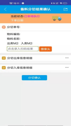 ![]() ![]() 補充說明:經(jīng)過上一步操作后,在網(wǎng)頁版的ERP系統(tǒng)就會出現(xiàn)相對應(yīng)的物料信息,但此時的物料信息還沒有分切. 3. 點擊”備料分切結(jié)果確認(rèn)”,進入該界面(如圖1),再次對物料上的標(biāo)簽(如圖2)進行掃碼,掃碼過后對該物料進行分切操作,操作人確認(rèn)分切信息無誤后點擊”分切確認(rèn)”.
