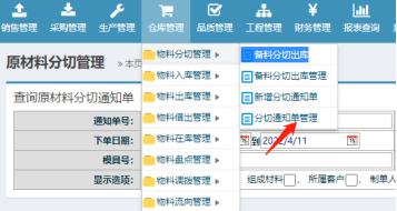 ![]() ![]() 圖:1 圖:2 補充說明:物料分切確認(rèn)后,可在網(wǎng)頁版的ERP系統(tǒng)進行查看該物料的分切情況. 4. 在谷歌瀏覽器上登錄ERP系統(tǒng),在”倉庫管理-->物料分切管理-->分切通知單管理”進行查看分切好的物料信息.如下圖所示: