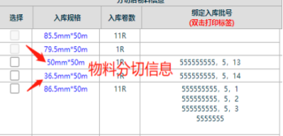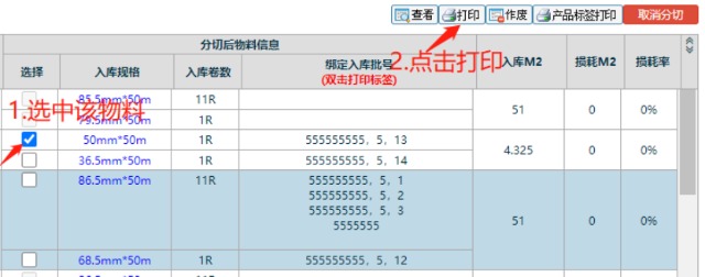 ![]() ![]() 圖:1 圖:2 5. 然后勾選上分切好的物料,進行標(biāo)簽打印,把打印好的標(biāo)簽重新貼上分切好的物料上.