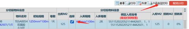 ![]() 圖:1 6. 如果發(fā)現(xiàn)物料分切信息出現(xiàn)錯誤或想要更改的話,進行以下操作:在該頁面下選中需要更改物料的分切信息,選中后點擊”取消分切” 取消分切后,該物料會回到未分切的狀態(tài),需要重新對物料進行分切,即重復(fù)一次步驟3的操作.