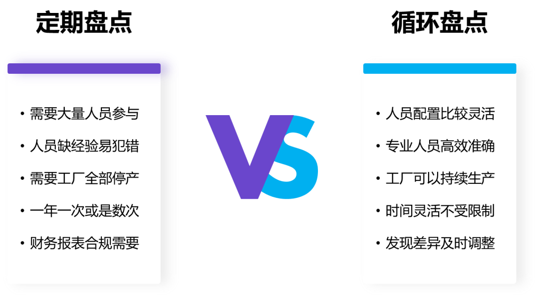 從以上五點(diǎn)來(lái)看,循環(huán)盤(pán)點(diǎn)比定期盤(pán)點(diǎn)有著明顯的優(yōu)勢(shì),更少的人力成本、基本不影響工廠生產(chǎn)、盤(pán)點(diǎn)效率更高,而且能夠及時(shí)發(fā)現(xiàn)問(wèn)題。那么為什么還需要做定期盤(pán)點(diǎn)呢?