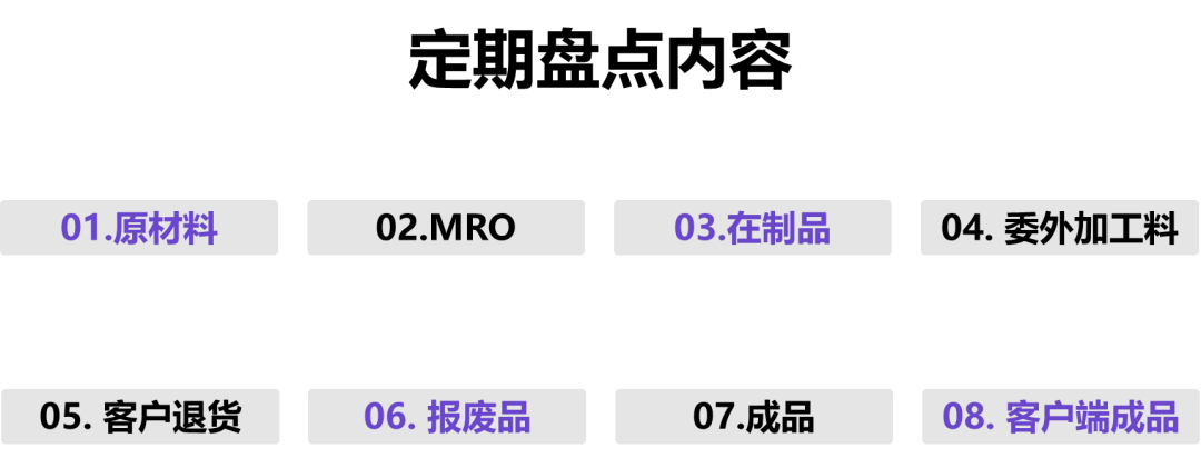 定期盤(pán)點(diǎn)是針對(duì)所有的庫(kù)存品進(jìn)行的大盤(pán)點(diǎn),包括了原材料、MRO、在制品、委外加工物料、客戶(hù)退貨、報(bào)廢品、成品和客戶(hù)端VMI成品等等。用一句話來(lái)形容,就是“一個(gè)都不能少”,凡是在ERP系統(tǒng)里有賬的,都要盤(pán)點(diǎn)。