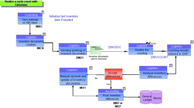 循環(huán)盤(pán)點(diǎn)的流程就比較簡(jiǎn)單。以下圖為例,根據(jù)ABC分類(lèi)法,在SAP系統(tǒng)中創(chuàng)建盤(pán)點(diǎn)文件,在盤(pán)點(diǎn)結(jié)束以后把統(tǒng)計(jì)結(jié)果輸入系統(tǒng)。接下來(lái)就是分析差異,制定改善行動(dòng)計(jì)劃,最后調(diào)整系統(tǒng)數(shù)據(jù)。循環(huán)盤(pán)點(diǎn)小組根據(jù)實(shí)際的工作量和人力資源情況,可以靈活地安排盤(pán)點(diǎn)計(jì)劃,每天對(duì)庫(kù)存進(jìn)行盤(pán)點(diǎn)。