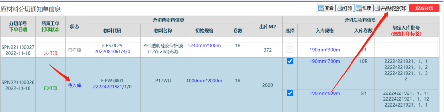 2. 找到分切規(guī)格錯誤要取消分切的分切單,勾上標(biāo)簽然后打印(然后關(guān)閉新頁面) 如下圖: