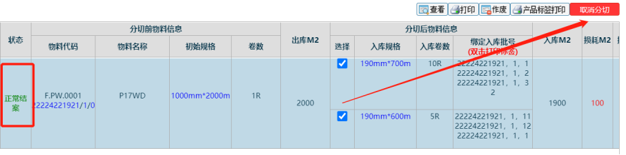 4. 將這些分切出來的物料入庫后,該分切單狀態(tài)變已結(jié)案,此時勾上后再取消分切 如下圖: