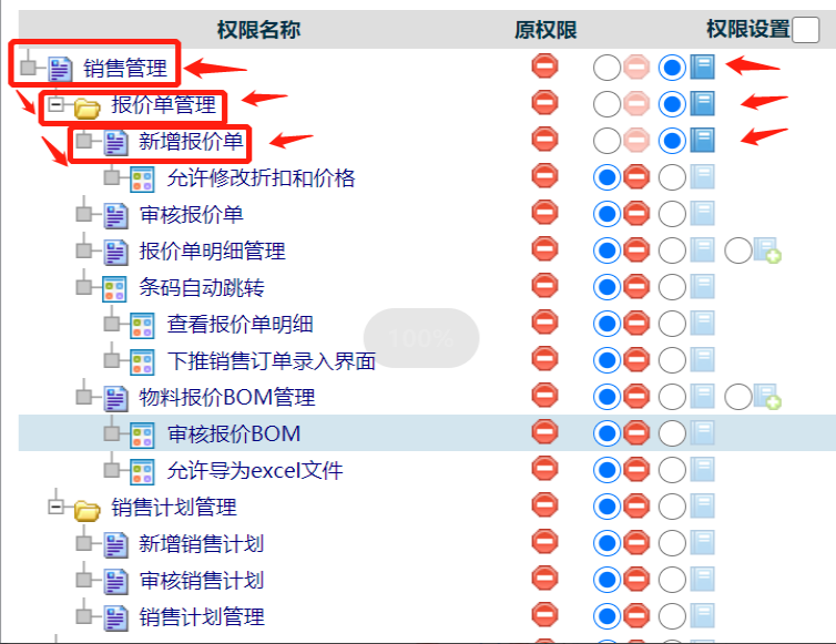 ![]() ![]() 1、在”系統(tǒng)管理-->用戶(hù)管理-->用戶(hù)權(quán)限維護(hù)”,點(diǎn)擊進(jìn)入 ![]() 2、按崗位來(lái)設(shè)置權(quán)限,首先選擇某一位崗位 ![]() 3、 ![]() 補(bǔ)充說(shuō)明:開(kāi)放某一個(gè)權(quán)限時(shí)要把第一級(jí)大類(lèi)的權(quán)限先開(kāi)放,然后把第二級(jí)子類(lèi)的也開(kāi)放,最后把第三級(jí)子類(lèi)開(kāi)放,這樣權(quán)限分配后才能起效。 例子:如分配新增報(bào)價(jià)單的權(quán)限,首先把“銷(xiāo)售管理”這個(gè)第一級(jí)大類(lèi)的權(quán)限點(diǎn)上, 然后再把“報(bào)價(jià)單管理”的權(quán)限也點(diǎn)上,最后把“新增報(bào)價(jià)單”的權(quán)限點(diǎn)上才能生效。 如下圖: ![]() 4、選完后,點(diǎn)擊更新權(quán)限即可 如下圖: ![]() 5、也可以按用戶(hù)來(lái)給開(kāi)放權(quán)限,首先點(diǎn)擊按用戶(hù)設(shè)置權(quán)限 如下圖: ![]() 6、然后選擇部門(mén),再選擇用戶(hù),然后再開(kāi)放權(quán)限,如之前的操作 如下圖: ![]() 相關(guān)教程: