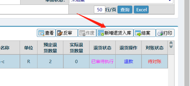 在本頁(yè)面查詢出要入庫(kù)的退貨單,點(diǎn)中后,然后點(diǎn)中,最后點(diǎn)擊”新增退貨入庫(kù)”,