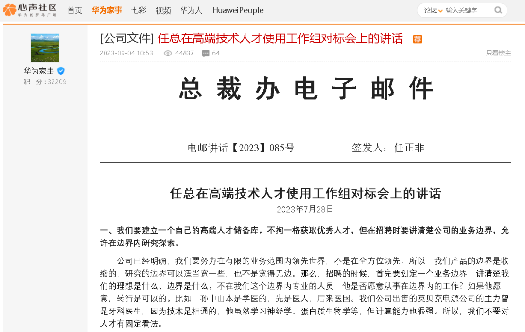 這幾天,華為Mate60 Pro賣爆了!關(guān)鍵時(shí)刻,任正非的講話又火了……9月4日,華為心聲社區(qū)發(fā)布了華為創(chuàng)始人任正非在華為高端技術(shù)人才使用工作組對(duì)標(biāo)會(huì)上的講話。在這次講話中,任正非全面闡述了他的“人才觀”,并強(qiáng)調(diào)“ 要努力在有限的業(yè)務(wù)范圍內(nèi)領(lǐng)先世界,不是在全方位領(lǐng)先?!?/span>任正非表示,華為已經(jīng)明確,要努力在有限的業(yè)務(wù)范圍內(nèi)領(lǐng)先世界,不是在全方位領(lǐng)先。所以,產(chǎn)品的邊界是收縮的,研究的邊界可以適當(dāng)寬一些。對(duì)于選拔人才,任正非稱,“我們要建立一個(gè)自己的高端人才儲(chǔ)備庫(kù),只要是優(yōu)秀人才都可以進(jìn)來,包括非邊界內(nèi)專業(yè)的人才愿意到邊界內(nèi)來工作,我們就愿意要。我們是儲(chǔ)備人才,不儲(chǔ)備美元,最終儲(chǔ)備出自己的人才庫(kù)?!?/span>任正非舉例稱,孫中山本是學(xué)醫(yī)的,先是醫(yī)人,后來醫(yī)國(guó),華為公司出售的莫貝克電源公司的主力曾是牙科醫(yī)生,因?yàn)榧夹g(shù)是相通的,他雖然學(xué)習(xí)神經(jīng)學(xué)、蛋白質(zhì)生物學(xué)等,但計(jì)算能力也很強(qiáng)。任正非認(rèn)為,物質(zhì)激勵(lì)不是最主要的,最主要是讓人才能找到自己熱愛的工作崗位。當(dāng)他熱愛時(shí),就會(huì)踏實(shí)工作。若果興趣愛好與工作機(jī)會(huì)相結(jié)合了,他就會(huì)無怨無悔。因此,要重視這些人才在工作崗位的發(fā)揮,同時(shí)也在貢獻(xiàn)上去評(píng)價(jià)他。任正非還表示,全才首先一定是專才,全才是從專才中成長(zhǎng)起來的。如果沒有專才,就不可能成為全才,沒有專才的“全才”也許沒有突破能力,繞著城墻轉(zhuǎn),找不到放“炸藥包”的地方。系統(tǒng)性的、闡述性的和構(gòu)建性的專家合起來也不行,就如皮蛋粥一樣,皮蛋還是皮蛋,粥還是粥,并沒有發(fā)生物理和化學(xué)性的轉(zhuǎn)變。任正非還指出,集體評(píng)議往往會(huì)埋沒人才。