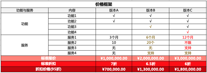后來,我嘗試了不同的明碼標(biāo)價(jià)形式,并將這些經(jīng)驗(yàn)整合成了一個(gè)通用的價(jià)格框架。價(jià)格框架,就是把我們提供的產(chǎn)品、價(jià)格、折扣范圍、折扣條件,“毫無保留地”羅列出來。它的目的在于將信息透明地呈現(xiàn)在客戶面前,告訴客戶:“這就是我們能給出的折扣范圍和條件,我們的談判必須在這個(gè)范圍內(nèi)進(jìn)行(至少無法大幅度偏離這個(gè)范圍)?!?span style="margin: 0px 6px; padding: 0px; outline: 0px; max-width: 100%; box-sizing: border-box !important; overflow-wrap: break-word !important; line-height: 1.7em !important;">它就如一個(gè)框,把雙方的談判框定在一個(gè)既定范圍內(nèi)。下面是一個(gè)通過價(jià)格框架來報(bào)價(jià)的示例。我們將不同版本的軟件的功能和服務(wù)差異、標(biāo)準(zhǔn)價(jià)格、對(duì)應(yīng)折扣等都一一羅列出來。