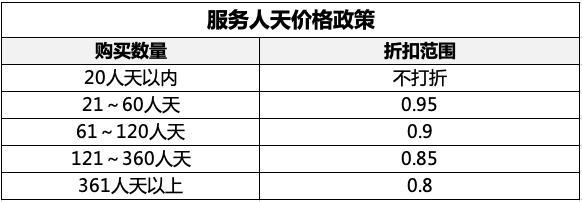 通過這份“價(jià)格框架表”,我們告訴客戶:“不用猜了,我能給出的折扣條件都在這里了!”價(jià)格框架的使用范圍很廣,不僅可以用于“產(chǎn)品”,也可以用于“服務(wù)”。例如軟件服務(wù),一般按一個(gè)服務(wù)人員服務(wù)一天的價(jià)格進(jìn)行結(jié)算,統(tǒng)稱為“人天價(jià)格”,我們也可以試著通過價(jià)格框架進(jìn)行報(bào)價(jià)(如下圖所示)。