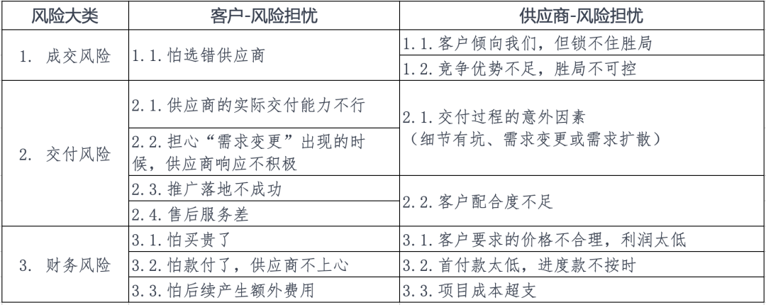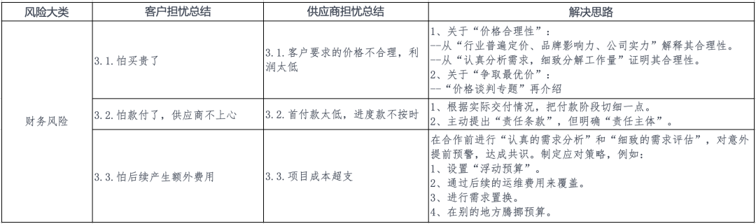 方法總是比障礙多的,它的核心在于提前分析和預警,形成共識,并設(shè)計好緩沖。 小結(jié)以上,就是我們對“財務(wù)風險”的分析與建議。財務(wù)風險總結(jié)起來有3個方面:1、價格分歧2、付款進度分歧3、額外費用分歧基于這三方面的分歧,以及“雙方的擔憂”和“解決思路”,我整理成了下面的表格: 該文章在 2023/10/10 11:58:39 編輯過 |