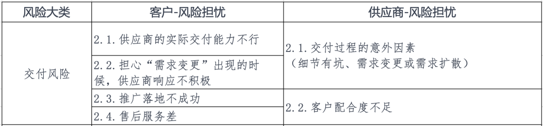 ![]() ![]() 引子在《成交階段的風(fēng)險(xiǎn)概覽》一文中,我們分別從“客戶視角”和“供應(yīng)商視角”總結(jié)了3類風(fēng)險(xiǎn),分別是:1、成交風(fēng)險(xiǎn)(選擇的風(fēng)險(xiǎn))2、交付風(fēng)險(xiǎn)(交貨的風(fēng)險(xiǎn))3、財(cái)務(wù)風(fēng)險(xiǎn)(吃虧的風(fēng)險(xiǎn))今天,我們來聊聊第二類風(fēng)險(xiǎn)——交付風(fēng)險(xiǎn)。 風(fēng)險(xiǎn)分析從客戶視角看,交付一般有4大疑慮:1、擔(dān)心供應(yīng)商實(shí)際交付能力不行(包括交付與承諾存在偏差、交付質(zhì)量不過關(guān)、交付進(jìn)度延誤等)。2、擔(dān)心“需求變更”出現(xiàn)的時(shí)候,供應(yīng)商響應(yīng)不積極。3、擔(dān)心交付后,在公司內(nèi)部落地不成功。4、擔(dān)心售后服務(wù)不行。從供應(yīng)商的風(fēng)險(xiǎn)看,則有2大交付疑慮:1、擔(dān)心交付過程存在意外因素(例如細(xì)節(jié)有坑、需求變更或需求擴(kuò)散)。2、擔(dān)心客戶配合度不足。 解決思路事實(shí)上,越是否定其中的風(fēng)險(xiǎn),而一味強(qiáng)調(diào)越自己服務(wù)好、態(tài)度正、經(jīng)驗(yàn)足,客戶越會(huì)擔(dān)心。——僅靠嘴巴往往無濟(jì)于事,甚至適得其反。最能打消客戶疑慮的方法,我覺得就是正視風(fēng)險(xiǎn),下笨功夫:1、認(rèn)真分析需求。2、細(xì)致評(píng)估工作量。3、做好交付計(jì)劃。但這恰恰是許多國內(nèi)企業(yè)的通病——他們不愿意在簽約前投入過多的精力。而且還是義正言辭的:-- 企業(yè)的資源和精力有限,這個(gè)階段還不知道能不能合作成。-- 簽約前,很難進(jìn)行深入的需求調(diào)研。-- 需求調(diào)研不夠深入,評(píng)估本身就很難精準(zhǔn),計(jì)劃就更難確定了。在這些認(rèn)知的推使下,銷售從業(yè)者(及所在的企業(yè))就構(gòu)筑起了一個(gè)這樣的循環(huán):