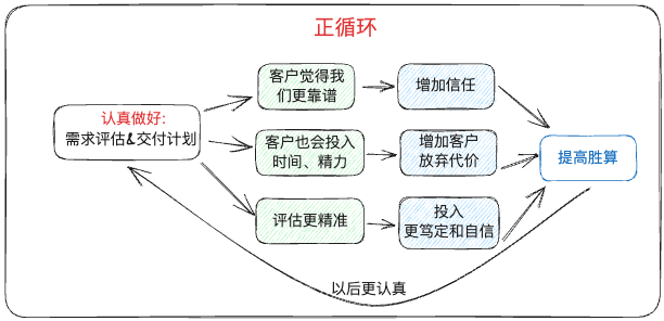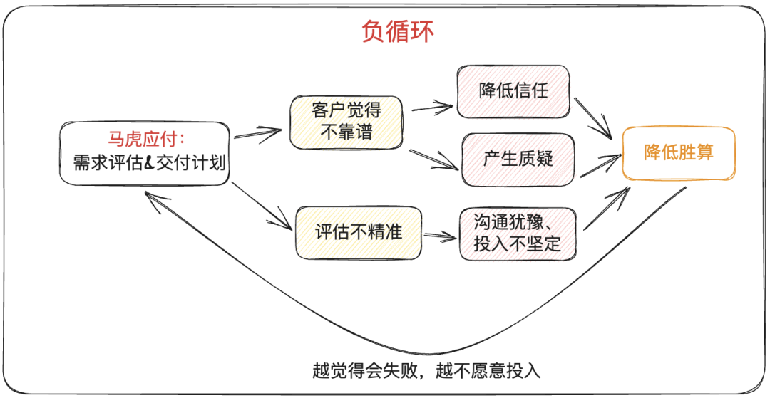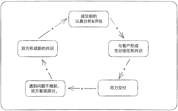的確,這種情況也是客觀存在的,特別是服務(wù)類、解決方案類的銷售場景,即便在前期的準(zhǔn)備工作中已經(jīng)規(guī)避掉了很多坑,但交付中還是會(huì)出現(xiàn)一些意外狀況。這是客戶和企業(yè)都不愿意看到,但又無法控制的,那要怎么應(yīng)對(duì)呢?我們可以借鑒外企的思路。在跟外企的合作中,我發(fā)現(xiàn)他們一般會(huì)設(shè)有浮動(dòng)預(yù)算,就是在合作前,雙方會(huì)確認(rèn)一個(gè)浮動(dòng)的百分比,作為對(duì)意外的緩沖。這個(gè)浮動(dòng)預(yù)算一般在5%~20%之間。在交付過程中,如果發(fā)生了不可控的需求變更或需求新增,就可以通過浮動(dòng)預(yù)算來處理。但5%~20%夠嗎?如果前期的評(píng)估工作沒做到位,不要說20%,可能200%都不一定夠。因此,浮動(dòng)預(yù)算有意義的前提是——“需求分析”、“工作量評(píng)估”和“交付計(jì)劃”做到位了!當(dāng)然,有些國企、央企由于制度方面的原因,無法設(shè)定浮動(dòng)預(yù)算,但我想強(qiáng)調(diào)的是,前面的工作做到位了,后續(xù)處理起來爭議就會(huì)少很多。畢竟,信任和共識(shí)才是最重要的,方法永遠(yuǎn)都是靈活的。只是很多銷售從業(yè)者怕影響合作,都“習(xí)慣性地”把這些工作拖到“合作以后”。但問題是,如果合作后才發(fā)現(xiàn)“意外”,而且還是“很多的意外”,那就很難處理了。所以,一個(gè)良性的循環(huán)應(yīng)該是這樣的: 落地風(fēng)險(xiǎn)我們?cè)賮砹牧摹敖桓兜膬?nèi)容能不能落地成功”的問題,這是客戶最擔(dān)憂的交付風(fēng)險(xiǎn)之一。銷售從業(yè)者可能會(huì)說: