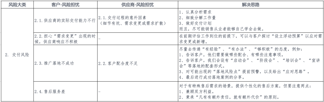 可能,有些銷售從業(yè)者會(huì)擔(dān)心客戶無法接受這樣的條件。但事實(shí)上,更多的時(shí)候,比起出了問題無法及時(shí)處理,客戶寧可付點(diǎn)費(fèi)用買個(gè)保險(xiǎn)。最怕的是,你既不提條件,也不響應(yīng)。退一萬步說,即便客戶真的不愿意答應(yīng)這一要求,這一條件至少可以作為換取其他條件的“談判籌碼”。(關(guān)于這部分我們后續(xù)再詳細(xì)展開。) 小結(jié)以上,就是本期對(duì)“交付風(fēng)險(xiǎn)”的分析與建議。我把上面的分析整理成了下面的表格: 人劃線 該文章在 2023/10/10 12:03:33 編輯過 |