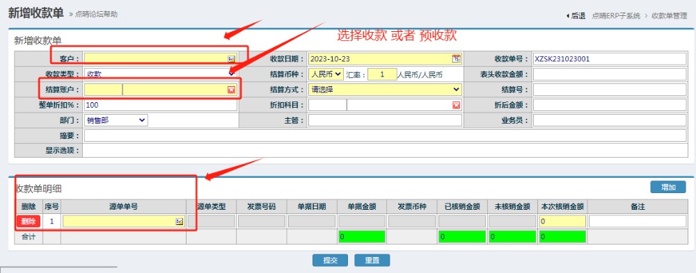 ![]() ![]() 新增收款單的前提是需要有銷售發(fā)票對應(yīng)的應(yīng)收款。 如果沒有應(yīng)收款收到了客戶的款項,是需要填制預(yù)收款單。