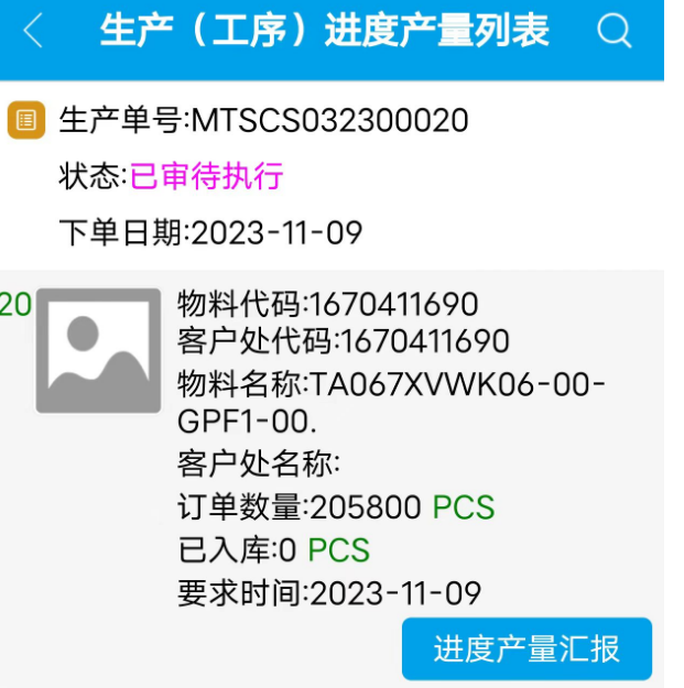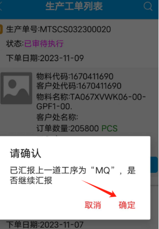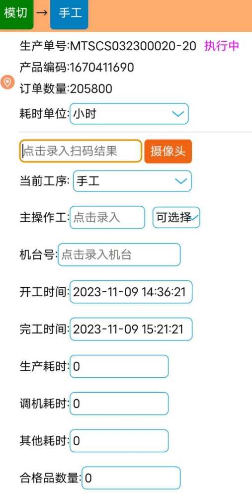 ![]() ![]() 1. 在APP上點(diǎn)開生產(chǎn)工序進(jìn)度產(chǎn)量匯報(bào) ![]() 2. 點(diǎn)擊進(jìn)度產(chǎn)量匯報(bào)進(jìn)入 如下圖: ![]() 點(diǎn)擊確定后,進(jìn)入?yún)R報(bào)頁(yè)面 ![]() 4. 然后掃碼錄入機(jī)臺(tái),操作工,填上調(diào)機(jī)時(shí)間,生產(chǎn)用時(shí),匯報(bào)數(shù)量,合格數(shù)量 如下圖: