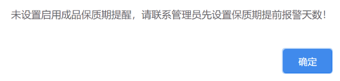 點(diǎn)晴模切ERP-彈出提示:未設(shè)置啟用成品保質(zhì)期提醒,請(qǐng)聯(lián)系管理員先設(shè)置保質(zhì)期提前報(bào)警天數(shù)