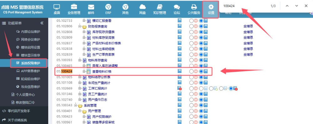 ![]() 以管理員權(quán)限點晴ERP系統(tǒng),進入設(shè)置-》系統(tǒng)維護設(shè)置-》系統(tǒng)維護管理-》系統(tǒng)權(quán)限維護: ![]() 在權(quán)限類別中選擇“05.點晴ERP子系統(tǒng)”,勾選權(quán)限內(nèi)碼,找到 05.100424 查看物料價格,即可為該崗位設(shè)置權(quán)限: