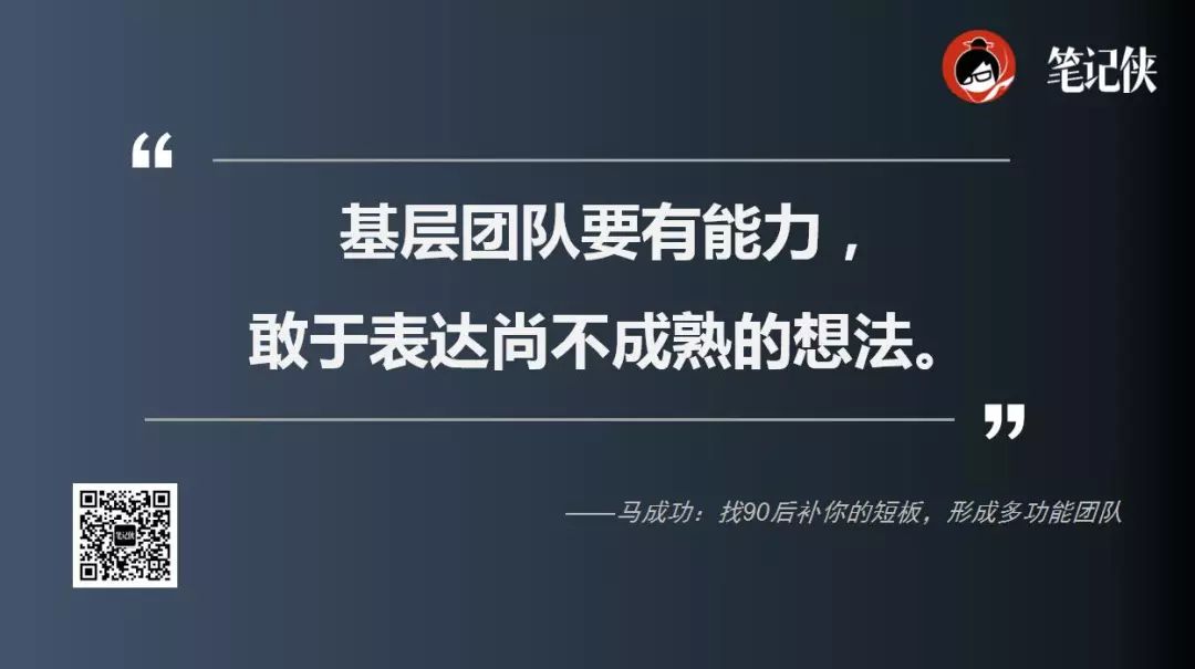 這啟示我們要發(fā)現(xiàn)90后的獨特價值,你做你擅長的,你有你的經(jīng)驗,找90后補你的短板,形成多功能團隊就可以了。