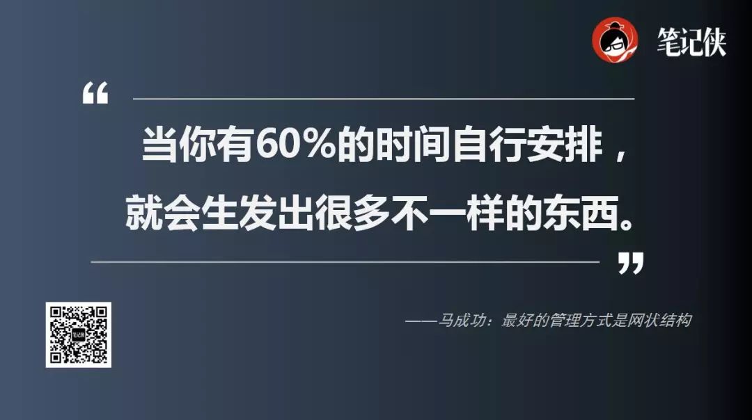 根源就是你的時間管理,你的時間管理百分之百被領導控制,就是剛才那樣的結局。當你有60%的時間自行安排,就會生發(fā)出很多不一樣的東西。