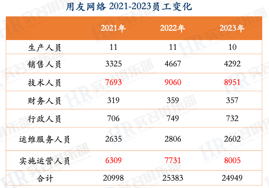用友為什么出現(xiàn)大幅虧損? 財報披露三個原因: 一是人工成本過高。 為搶占企業(yè)數(shù)智化、信創(chuàng)國產(chǎn)化等戰(zhàn)略機遇,用友加大戰(zhàn)略投入,2021-2022年,員工規(guī)模凈增加7301人,導致工資薪酬增加較多。 二是市場費用增加。 組織模式升級后,覆蓋全國市場發(fā)生的差旅費、市場費用增加較多。 2023年,用友啟動歷史上最大的一次業(yè)務組織模式升級,大型企業(yè)客戶業(yè)務由原來以地區(qū)為主的組織模式升級為以行業(yè)為主的組織模式,中型企業(yè)客戶業(yè)務繼續(xù)按照區(qū)域但全國統(tǒng)一、垂直組織開展。 三是外包費用增加。 公司按照既定略加快推進客戶項目實施與客戶化開發(fā)外包,培育專業(yè)服務生態(tài),公司外包成本同比增加較多。 附一張用友最近三年員工變化明細。 很明顯,現(xiàn)場實施人員和技術人員有大幅增加。