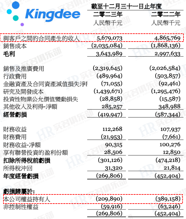 再來看金蝶的收入。 2023年金蝶收入56.7億,2022年是48.7億,同比有明顯增長。 從收入和員工規(guī)模來看,用友比金蝶差不多大一倍。 金蝶也是虧損的,2023年虧損2.09億,2022年虧損3.89億。