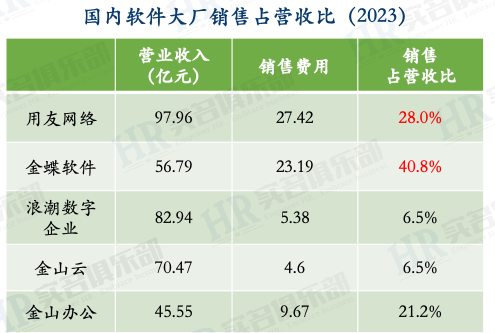 金蝶和用友轉型企業(yè)云服務,決心都非常大。 3、銷售情況 前面提到,用友虧損的一個原因,銷售與營銷費用開支較大,2023年銷售費用占比28%。 其實,金蝶的營銷開支比例更大,占比超過40%。