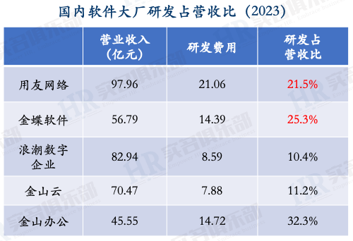 4、研發(fā)情況 直接看五家公司的研發(fā)占比。 用友和金蝶的研發(fā)占營收比在22-25%之間,差距不太大。