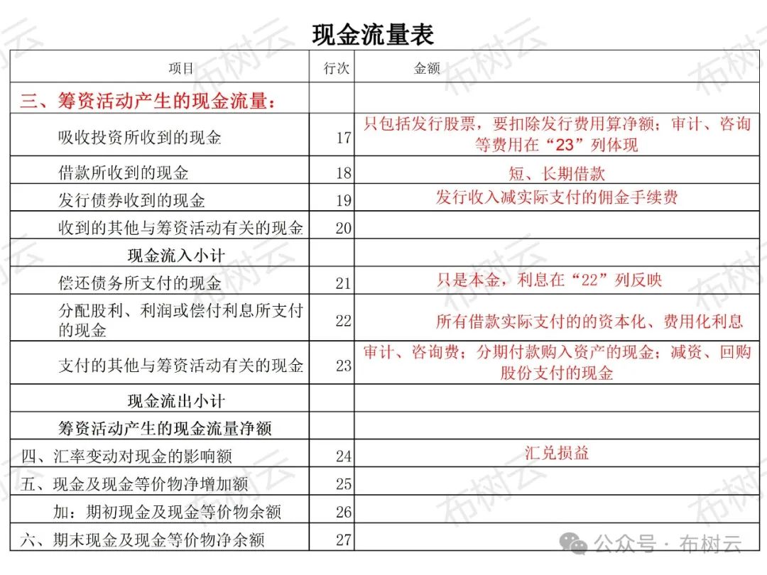 將凈利潤(rùn) (權(quán)責(zé)發(fā)生制)調(diào)節(jié)為經(jīng)營(yíng)活動(dòng)現(xiàn)金流量 (收付實(shí)現(xiàn)制) 采用間接法調(diào)整(以凈利潤(rùn)為起點(diǎn),調(diào)整非現(xiàn)金和非經(jīng)營(yíng)活動(dòng)的項(xiàng)目): ①實(shí)際沒(méi)有支付現(xiàn)金的費(fèi)用; (原來(lái)減,現(xiàn)在加) ②實(shí)際沒(méi)有收到現(xiàn)金的收益; (原來(lái)加,現(xiàn)在減) ③不屬于經(jīng)營(yíng)活動(dòng)的損益; (有加有減) ④經(jīng)營(yíng)性應(yīng)收應(yīng)付項(xiàng)目的增減變動(dòng)。 (有加有減) 從利潤(rùn)表到現(xiàn)金流量表的具體調(diào)整方法: 凈利潤(rùn) (利潤(rùn)表中) 加:①資產(chǎn)減值準(zhǔn)備。②信用損失準(zhǔn)備 (如: 壞賬準(zhǔn)備)。③固定資產(chǎn)折舊(只考慮提取數(shù), 不考慮處置、報(bào)廢等減少數(shù))。④無(wú)形資產(chǎn)和長(zhǎng)期待攤費(fèi)用的攤銷。 (此①-④因?yàn)槭菦](méi)有支付的費(fèi)用,所以需要加回) 加:⑤處置固定、無(wú)形和其他長(zhǎng)期資產(chǎn)的損失。⑥固定資產(chǎn)報(bào)廢損失。⑦凈敞口套期損失。⑧公允價(jià)值變動(dòng)損失。⑨財(cái)務(wù)費(fèi)用。⑩投資損失。 (次⑤-⑩假如產(chǎn)生的是收益則以 "-"號(hào)填列,因?yàn)椴粚儆诮?jīng)營(yíng)活動(dòng)的損益,需要反向調(diào)整) 上述①——⑩為利潤(rùn)表相關(guān)的項(xiàng)目 加:⑾遞延所得稅負(fù)債增加。⑿經(jīng)營(yíng)性應(yīng)付項(xiàng)目的增加,(⑾、⑿減少以 "-"號(hào)填列)。⒀遞延所得稅資產(chǎn)減少。⒁存貨的減少。⒂經(jīng)營(yíng)性應(yīng)收項(xiàng)目的減少,(⒀——⒂增加以 "-"號(hào)填列) 上述⑾——⒂為資產(chǎn)負(fù)債表項(xiàng)目 =經(jīng)營(yíng)活動(dòng)產(chǎn)生的現(xiàn)金流量?jī)纛~ 點(diǎn)晴模切ERP更多信息:http://moqie.clicksun.cn,聯(lián)系電話:4001861886 該文章在 2024/4/18 18:06:41 編輯過(guò) |