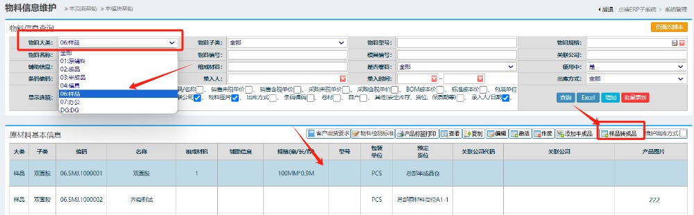 進(jìn)入菜單后,選擇樣品類型資料,選擇對(duì)應(yīng)的樣品資料,點(diǎn)擊樣品轉(zhuǎn)成品按鈕