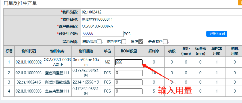 在新窗口里輸入用量可以推算預(yù)計生產(chǎn)量,輸入數(shù)量后回車即可 如下圖: