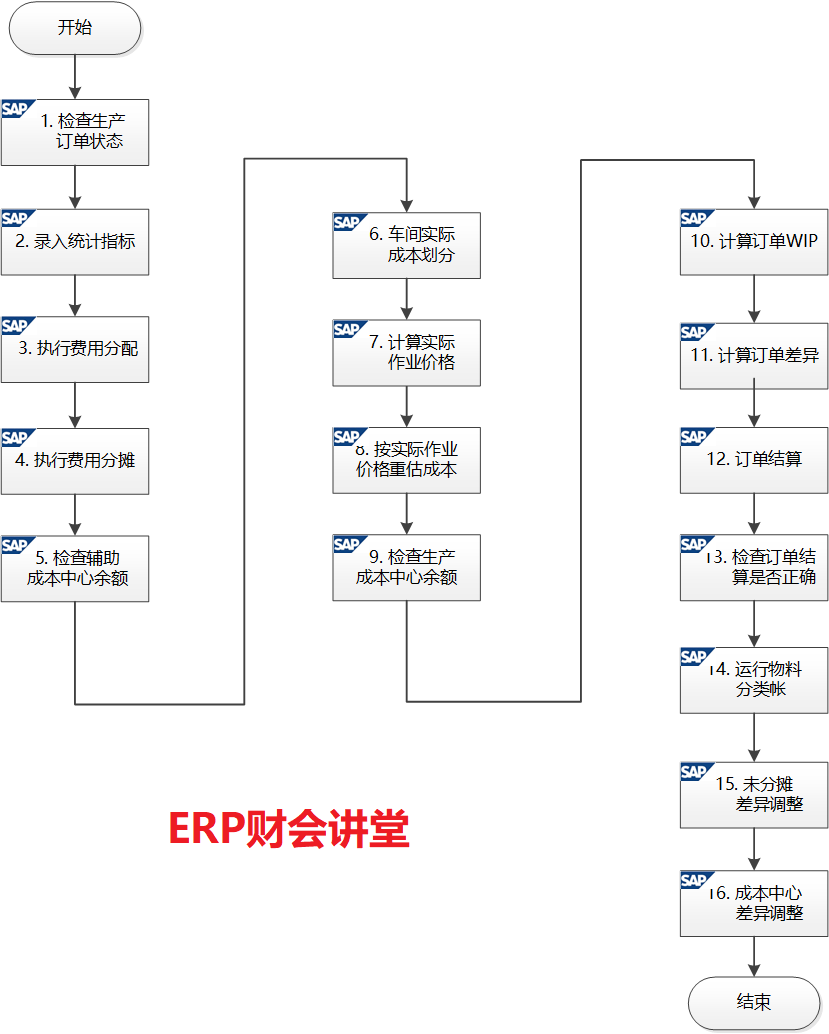 6)檢查采購預(yù)制發(fā)票是否過賬:MIR5查看發(fā)票憑證清單。如果企業(yè)使用了采購發(fā)票預(yù)制功能,結(jié)賬前需檢查是否所有的預(yù)制發(fā)票已經(jīng)過賬。采購發(fā)票預(yù)制會占用會計憑證編號,如果預(yù)制后又刪除,會造成會計憑證斷號。7)檢查銷售預(yù)制發(fā)票是否過賬:VF05N查看銷售發(fā)票清單。如果企業(yè)使用了銷售發(fā)票預(yù)制功能,結(jié)賬前需檢查是否所有的預(yù)制發(fā)票已經(jīng)過賬。8)在建工程訂單結(jié)算:KO8G訂單結(jié)算,如果啟用了投資管理功能進行在建工程管理,月底時需要對在建工程訂單進行結(jié)算,將訂單成本結(jié)轉(zhuǎn)到在建工程上。9)運行折舊:AFAB運行折舊,AFBP查看折舊運行日志。10)檢查生產(chǎn)訂單狀態(tài):COHV批量處理訂單,CO02單個修改訂單,COOIS訂單信息系統(tǒng)。生產(chǎn)訂單結(jié)算之前,財務(wù)人員需要檢查訂單是否關(guān)閉,訂單報工是否正確,訂單的投入產(chǎn)出是否合理。例如生產(chǎn)100輛汽車,只消耗了50臺發(fā)動機,明顯不合常理。本步驟非常關(guān)鍵,影響到產(chǎn)品成本是否準(zhǔn)確。如果結(jié)賬完成后,發(fā)現(xiàn)成本異常,回頭分析發(fā)現(xiàn)物料消耗不準(zhǔn)確,此時需要反結(jié)賬,然后再重新結(jié)賬。這樣不僅麻煩,而且產(chǎn)生了許多不必要的會計憑證。11)統(tǒng)計指標(biāo)錄入:KB31N錄入統(tǒng)計指標(biāo)。如果費用在不同的成本中心之間按固定比例分配,則忽略此步驟;如果按統(tǒng)計指標(biāo)分配,則需要錄入統(tǒng)計指標(biāo)的量。12)執(zhí)行費用分配:KSV5執(zhí)行分配循環(huán),KSV3顯示分配循環(huán)。本步驟將公共成本中心的費用分配到不同的成本中心。例如,將水電車間的費用,分配到不同的生產(chǎn)車間。13)執(zhí)行費用分?jǐn)?/span>:KSU5執(zhí)行分?jǐn)傃h(huán),KSU3顯示分?jǐn)傃h(huán)。本步驟作用同費用分配,只是將公共成本中心的費用以次級成本要素的方式分配到其他成本中心。執(zhí)行完費用分配/分?jǐn)傊?,需要檢查公共成本中心的余額是否為0。14)實際成本劃分:KSS2執(zhí)行費用分割,將生產(chǎn)成本中心的費用進行分組,計算每出一組的金額。15)計算實際作業(yè)價格:KSII計算作業(yè)類型實際價格,根據(jù)上一步計算的金額除以成本中心作業(yè)類型數(shù)量得到實際單價。計算完成后通過KSBT檢查作業(yè)價格,如果價格為0說明計算失敗。16)按實際價格重估訂單成本:CON2按實際價格重估。訂單報工時以計劃作業(yè)價格從成本中心結(jié)轉(zhuǎn)成本到訂單,月底得到成本中心實際費用后,計算出實際作業(yè)價格,將作業(yè)成本差異調(diào)整到生產(chǎn)訂單上。執(zhí)行完CON2之后,需要檢查生產(chǎn)成本中心余額是否為0,如果不為0需分析原因,再進行下一步操作。17)計算訂單WIP:KKAO計算生產(chǎn)訂單在產(chǎn)品金額。18)計算訂單差異:KKS1/KKS5計算生產(chǎn)訂單投入產(chǎn)出差異。19)訂單結(jié)算:CO88生產(chǎn)訂單結(jié)算。執(zhí)行完CO88后,需要檢查訂單結(jié)算是否正確,公式為“生產(chǎn)成本-投入 + 制造費用 = 生產(chǎn)成本-產(chǎn)出”。例如生產(chǎn)成本科目編號為5001開頭,核對5001*科目的余額和生產(chǎn)成本中心費用總額是否相等即可。20)運行物料分類賬:CKMLCP運行物料分類賬。運行物料分類賬主要處理以標(biāo)準(zhǔn)價計價物料的差異,運行完物料分類賬之后,差異科目余額應(yīng)為0。一般執(zhí)行到“過賬清算”時,執(zhí)行CKMVFM分析未分?jǐn)偛町悾缓笤賵?zhí)行“過賬清算”。21)未分?jǐn)偛町愓{(diào)整:F-02錄入憑證。執(zhí)行完CKMLCP之后如果存在未分?jǐn)偛町?,手工將差異科目調(diào)整為0,一般調(diào)整至主營業(yè)務(wù)成本。22)成本中心差異調(diào)整:F-02錄入憑證。執(zhí)行CON2作業(yè)價格重估后,成本中心可能存在尾差(一般都是幾分錢),手工將其調(diào)整至主營業(yè)務(wù)成本。如果以標(biāo)準(zhǔn)價計價的物料消耗到成本中心,執(zhí)行完CKMLCP之后差異被重估到成本中心,此差異也需要調(diào)整到主營業(yè)務(wù)成本。